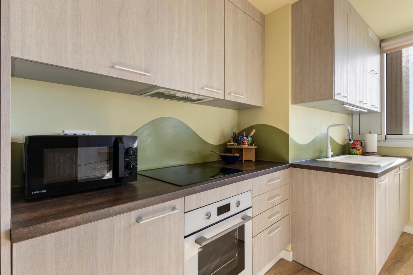 El apartamento cuenta con 1 dormitorio, 1 baño, ropa de cama, toallas, TV, cocina totalmente equipada y terraza con vistas al mar.